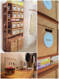 Langat olivat pääosin valmiiksi Ikean lokerohyllykön laatikoissa ja niihin ne jätettiin. Isoimmille materiaaleille ja keskeneräisille käsitöille hankittiin isot rottinkikorit. Keskeneräisiä tuppaa käsityöihmisillä kertymään. Niiden määrää saa karsittua paitsi realistisesti arvioimalla, mitkä oikeasti tulee tekemään valmiiksi, myös tilan rajaamisen tekniikalla: töille määrätään tietty hylly tai laatikko, johon kaiken on mahduttava, tai muuten vähennetään.